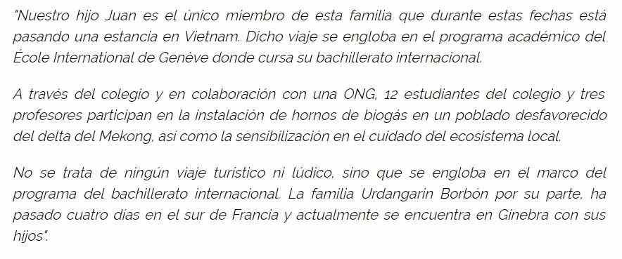 O sea, más o menos, la historia es que La Otra Cónica (LOC) supo (o alguien se lo dijo) que un hijo de Urdangarín y la Infanta estaba en el Vietnam. Y los de LOC supusieron (o alguien se lo hizo suponer) que estaba toda la familia. Y no confirmaron nada. Y convirtieron un rumor en una noticia y, además, hicieron a un titular tendencioso. Y pusieron una foto falsa y la colaron como buena. Foto falsa porque si el matrimonio no estaba donde ellos decían que estaba, la foto era imposible, por lo tanto era falsa. Y cuando salió el comunicado de desmentido, borraron todo rastro de la noticia... menos el titular con la foto, que todavía está.