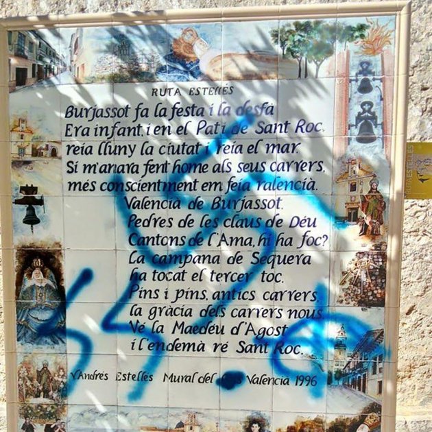 La figura del poeta Vicent Andrés Estellés ha vuelto a ser objeto de un ataque vandálico en Burjassot, su pueblo natal. En este caso ha sido un mural de un fragmento de su obra 'El mural del País Valencià' que ha aparecido con simbología nazi como una esvástica, el símbolo de las 'SS' y una cruz celta, además se ha tapado la palabra "País" del mural de azulejos.