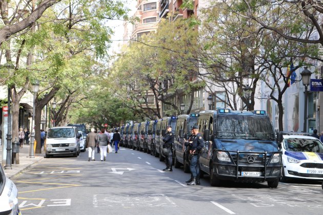 Los simpatizantes de los partidos políticos también han tenido que hacer caso a la policía y mantener una posición controlada detrás de las vallas de seguridad. Las banderas del PSPV y Compromís, en un lado, y las españolas portadas por grupos de ultraderecha enfrente, se saludaban al tiempo que estos gritaban "Compromís, malnacidos y Viva España. El resto de ciudadanos, hasta unos cuantos millares, han visto lo que han podido y se sumaban a ciegas a los gritos y aplausos que se producían espontáneamente.