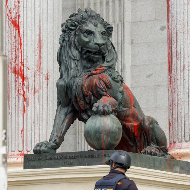 Una decena de activistas contra el cambio climático han lanzado pintura este jueves contra la fachada del Congreso de los Diputados y han teñido de rojo una de las dos esculturas de leones que se encuentran ante la cámara baja, y también una de las columnas que sostienen el arco de la entrada principal. Los activistas pertenecen a organizaciones como 'Rebelión Científica', 'Futuro Vegetal' y 'Extinction Rebellion'. "Los verdaderos criminales son los del Gobierno", ha manifestado uno de los portavoces de esta formación, justo después de que la policía española identificara y se llevara detenidos a unos ocho manifestantes.