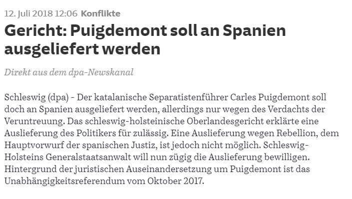 La agencia alemana Deutsche Presse Agentur (DPA) ha manifestado que el Tribunal de Schleswig-Holstein ha aceptado la extradición del president en el exilio, Carles Puigdemont, por tan sólo malversación, pero que en cambio ha decaído "la principal acusación de la Justicia española", que defendía la rebelión.