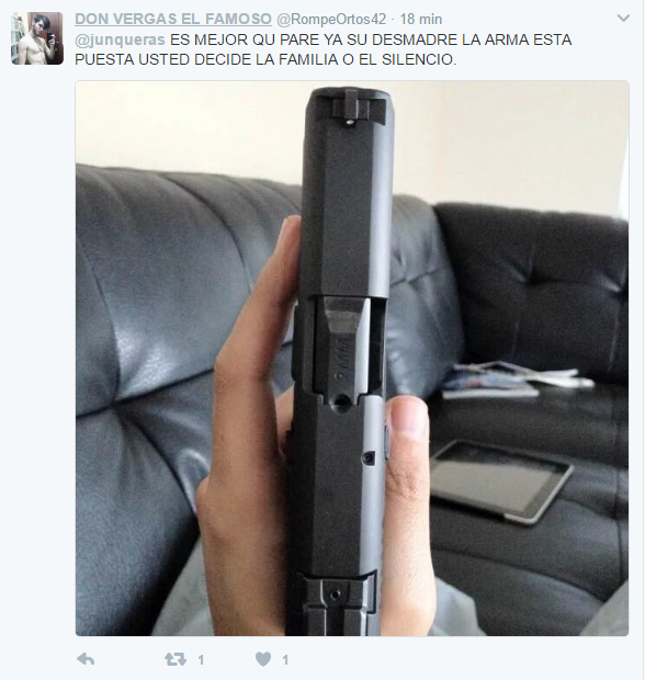 No ha sido el único que lo ha hecho. También el usuario Don Vergas El Famoso, ha adjuntado la foto de otra arma y ha escrito: "Es mejor que pare ya su desmadre, la arma esta puesta, usted decide la familia o el silencio".