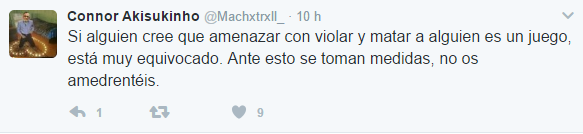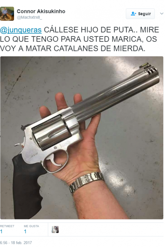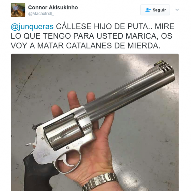 Bajo el nombre de Connor Akisukinho, un usuario ha colgado en Twitter una foto de una pistola con el texto "Cállese hijo de puta... mire lo que tengo para usted marica, os voy a matar catalanes de mierda".