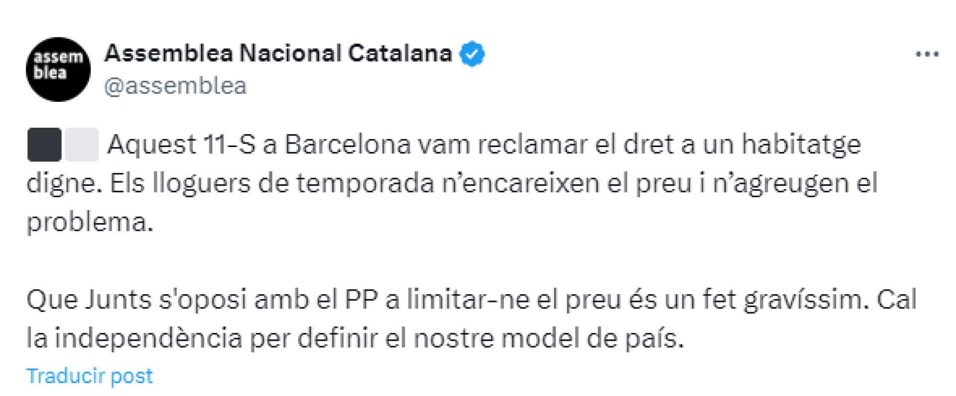 La Assemblea Nacional Catalana (ANC) se ha sumado a las críticas contra Junts per Catalunya por haber votado en contra de la proposición de ley para debatir regular los alquileres de temporada y de habitaciones. "Que Junts se oponga con el PP a limitar el precio es un hecho gravísimo", ha afirmado la entidad a través de una publicación en X este miércoles, que ha recordado que una de las demandas principales de la manifestación del pasado 11 de septiembre era el derecho a una vivienda digna. "Los alquileres de temporada encarecen el precio y agravan el problema", ha señalado la entidad, que con todo, ha situado la "independencia" como la herramienta imprescindible para "definir el modelo de país". La ANC se suma así a una avalancha de críticas liderado por el Sindicat de Llogaters, impulsor de la propuesta legislativa, que ha acusado a Junts de actuar "como títere de la patronal inmobiliaria". Voces de Esquerra, la CUP, Sumar, Podemos, y más tímidamente, del PSOE, también han disparado contra los juntaires y han señalado su alineamiento con PP y Vox.