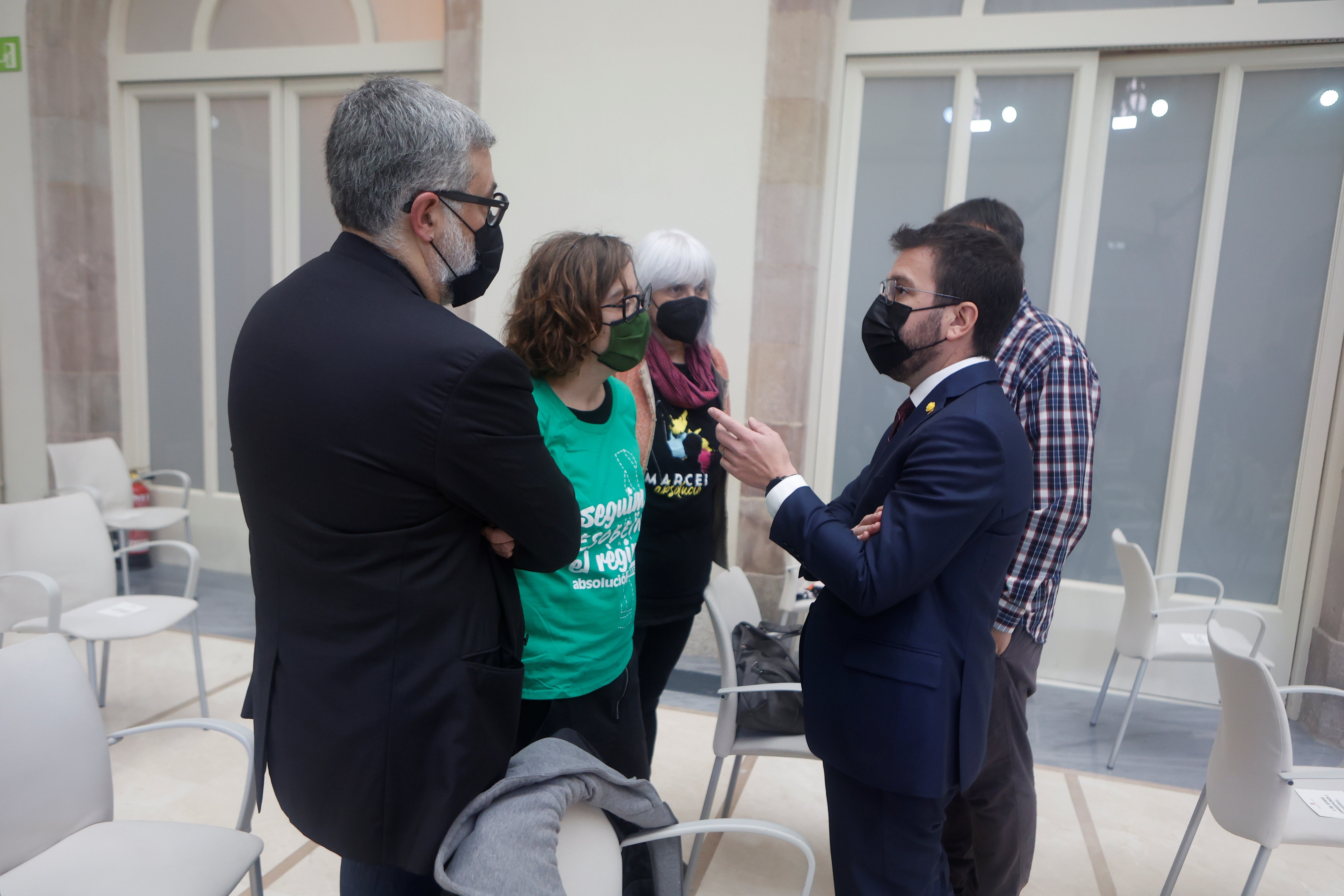 Aragonès con diputados de la CUP en el Parlament. / EFE