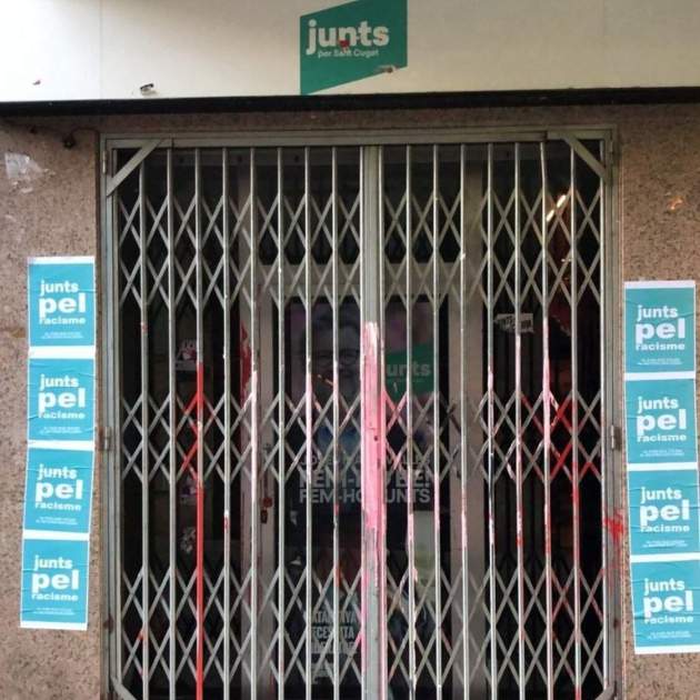 Vándalos intolerantes vuelven a atacar la sede de JuntsSantCugat tildándonos de racistas por exigir 10 años de empadronamiento para acceder a una vivienda pública. ¿Podemos decir ya que son unos fascistas? pic.twitter.com/U9XPS1nuYx