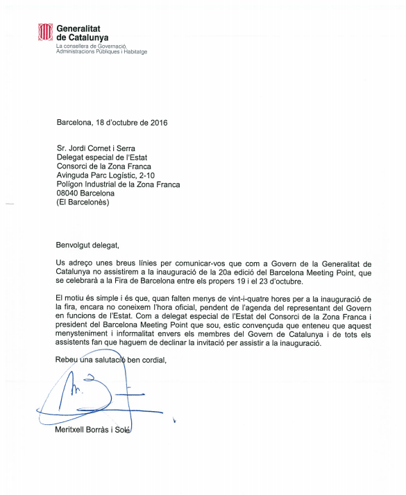 "Como delegado especial del el Estado del Consorcio de la Zona Franca y presidente de la Barcelona Meeting Point que sois, estoy convencida/o de que entendéis que este menosprecio e informalidad hacia los miembros del Govern de Catalunya y de todos los asistentes hacen que tengamos que declinar la invitación a la inauguración", señala los consellers en la carta.