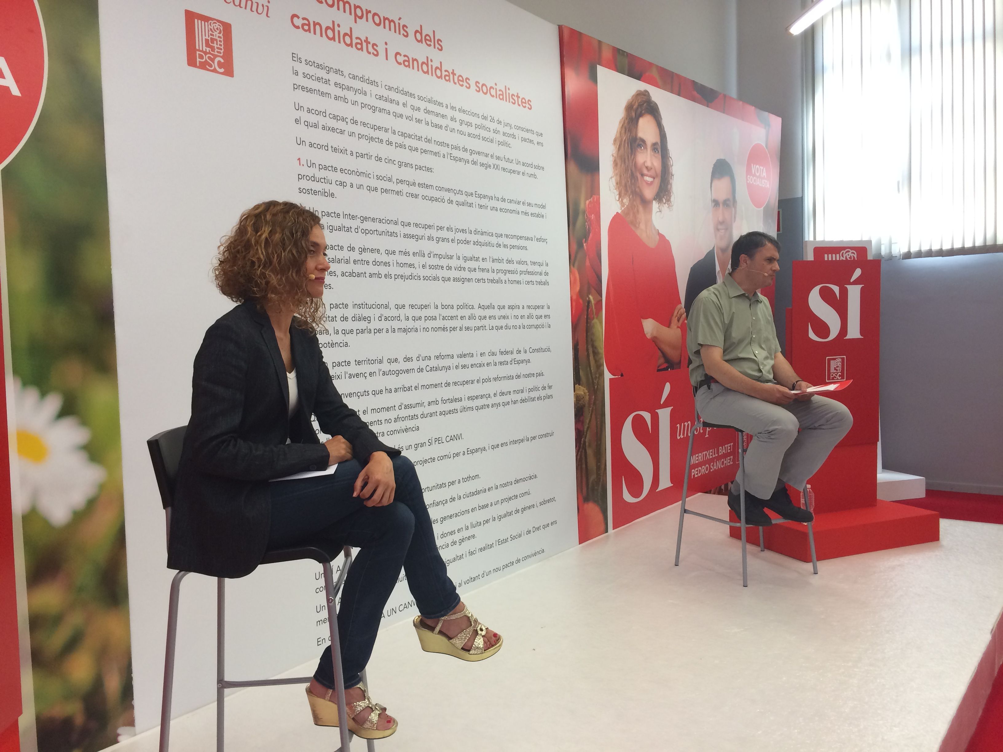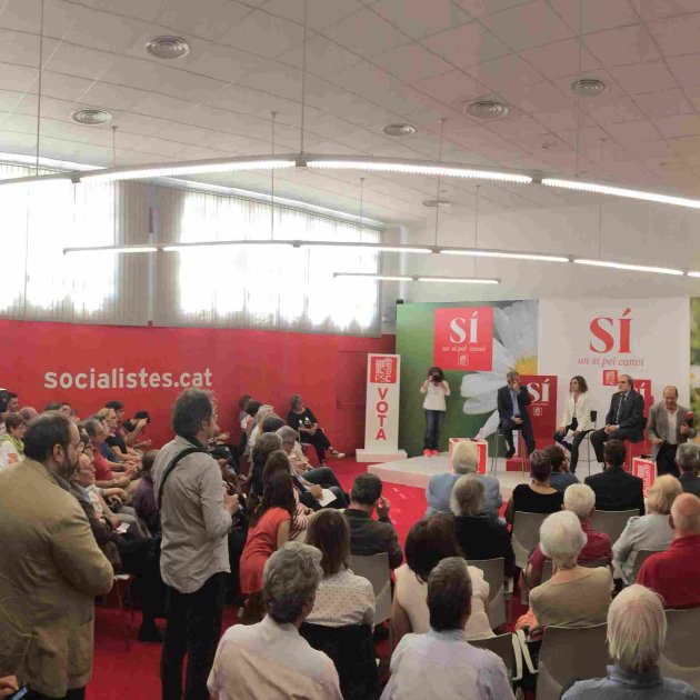 Calle Nicaragua, cuarto piso. El antiguo salón de actos de la sede del PSC se ha convertido en el epicentro de su campaña para el 26-J. En la agenda del día ya no hay visitas a mercados ni grandes mítines en polideportivos. Se han sustituido por lo que desde el partido han llamado “diálogos”, en un espacio que recuerda más a un plató de televisión que a un auditorio.