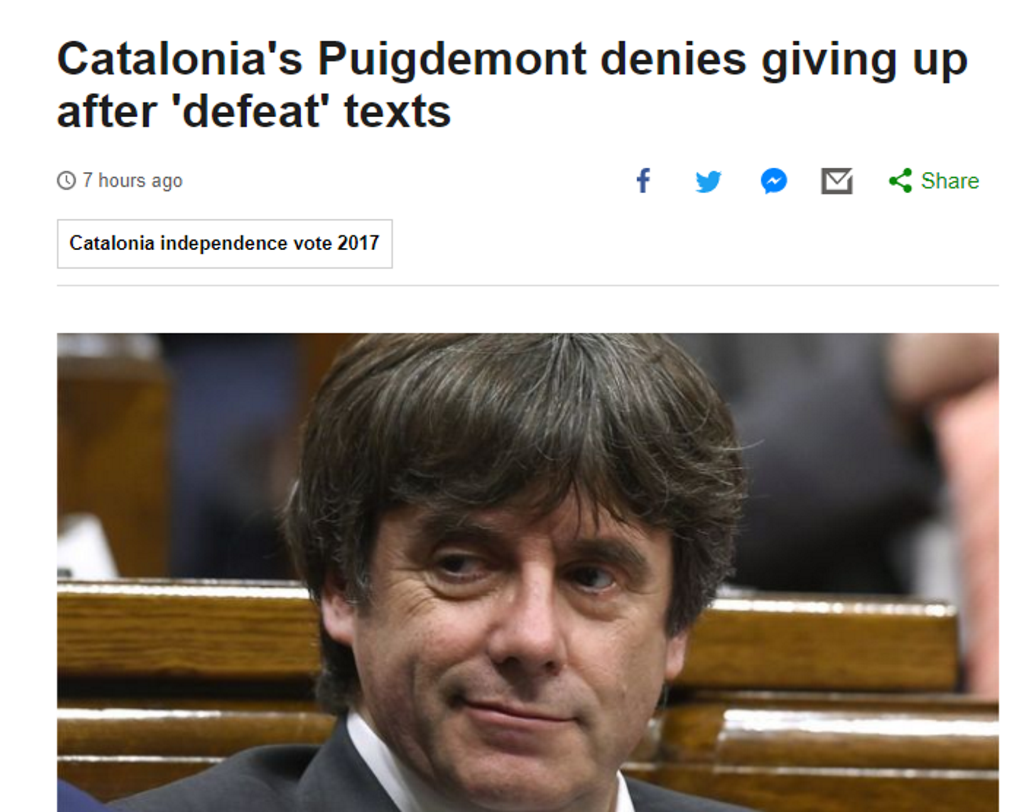 "El político huido catalán Carles Puigdemont ha negado que renuncie a liderar una Catalunya independiente, después de que mensajes suyos de carácter privado han sido difundidos en la televisión española", indica. Según la BBC, Puigdemont ha reconocido que ha tenido momentos de duda, pero añade que ha insistido: "Seguimos".