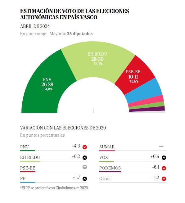 La mayoría de los sondeos publicados este lunes apuntan a una victoria de EH Bildu. Es el caso de la encuesta de Sigma Dos para El Mundo, que afirma que los independentistas se adelantan a los nacionalistas y se plantarían con 28-30 escaños, sumando casi una decena de representantes más que en 2020. Por su parte, el PNV bajaría de los 31 diputados actuales a 26-28. Ninguna de las dos formaciones alcanzaría por sí sola la mayoría absoluta, situada en los 38 diputados, así que necesitarían apoyo de otras fuerzas. El PNV parte de una mejor posición a la hora de pactar, ya que hasta ahora ha gobernado en coalición con los socialistas vascos, el PSE. Los 10-11 escaños que se prevén para los socialistas dan la suma justa para llegar a esta mayoría. Aunque en los escenarios menos optimistas para el PNV, ni esta suma sería suficiente.