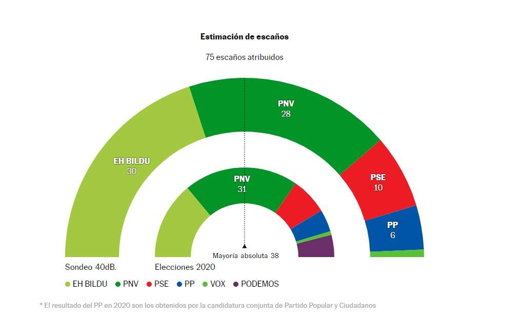 En la encuesta de 40dB para El País, la victoria con 30 diputados de Bildu se repite, así como la segunda posición del PNV (28). De nuevo, la tercera fuerza serían los socialistas, repitiendo sus 10 representantes actuales. En este caso, los nacionalistas y el PSE sumarian justo el número de diputados necesarios para la mayoría absoluta. En este escenario, el PP se quedaría estancado en los actuales 6 diputados.