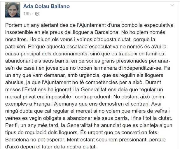 En un escrito en Facebook, la alcaldesa de Barcelona ha criticado a la Generalitat porque asegura que desde el consistorio "llevemos un año alertando de una burbuja especulativa insostenible", pero que desde la Generalitat les decían "que regular un mercado privado era imposible y contraproducente". Colau asegura que "por fin" el Govern ha dado el paso, matizando que lo hace "un año tarde", y pide que se concrete la medida.