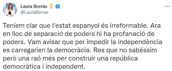También ha comentado la noticia la presidenta de Junts, Laura Borràs, que ha insistido en el hecho de que "el estado español es irreformable". "Ahora en lugar de poderes hay profanación de poderes", ha añadido, antes de recordar que el independentismo ya "avisó de que para impedir la independencia se cargarían la democracia". "Nada que no supiéramos pero una razón más para construir una república democrática e independiente", ha concluido en un tuit.