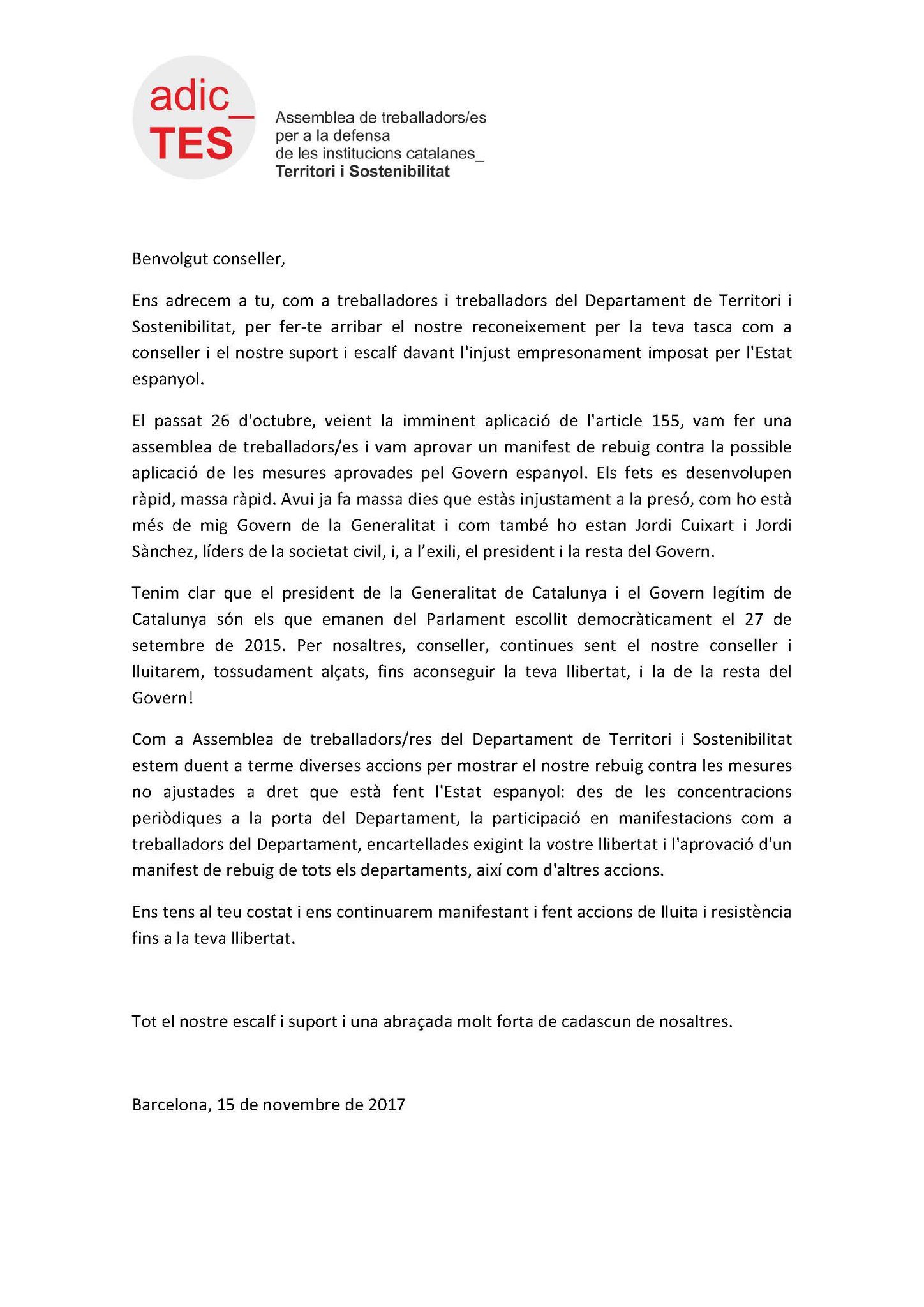 Los trabajadores de Territori i Sostenibilitat han dirigido una carta a Rull, en qué le trasladan su "apoyo y calor ante el injusto encarcelamiento impuesto por el Estado" y su "reconocimiento" por su tarea al frente del Departament. En la misiva, los trabajadores también le dejan claro que reconocen el presidente Carles Puigdemont y su Govern como los "legítimos" porque son "les emanan del Parlamento escogido democráticamente el 27 de septiembre del 2015".