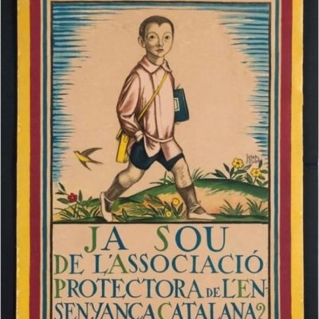 Ponsatí ha añadido una imagen histórica, el cartel que diseñó el pintor Josep Obiols, su abuelo y padre de Raimon Obiols, para la Associació Protectora de l'Ensenyança Catalana el año 1921.