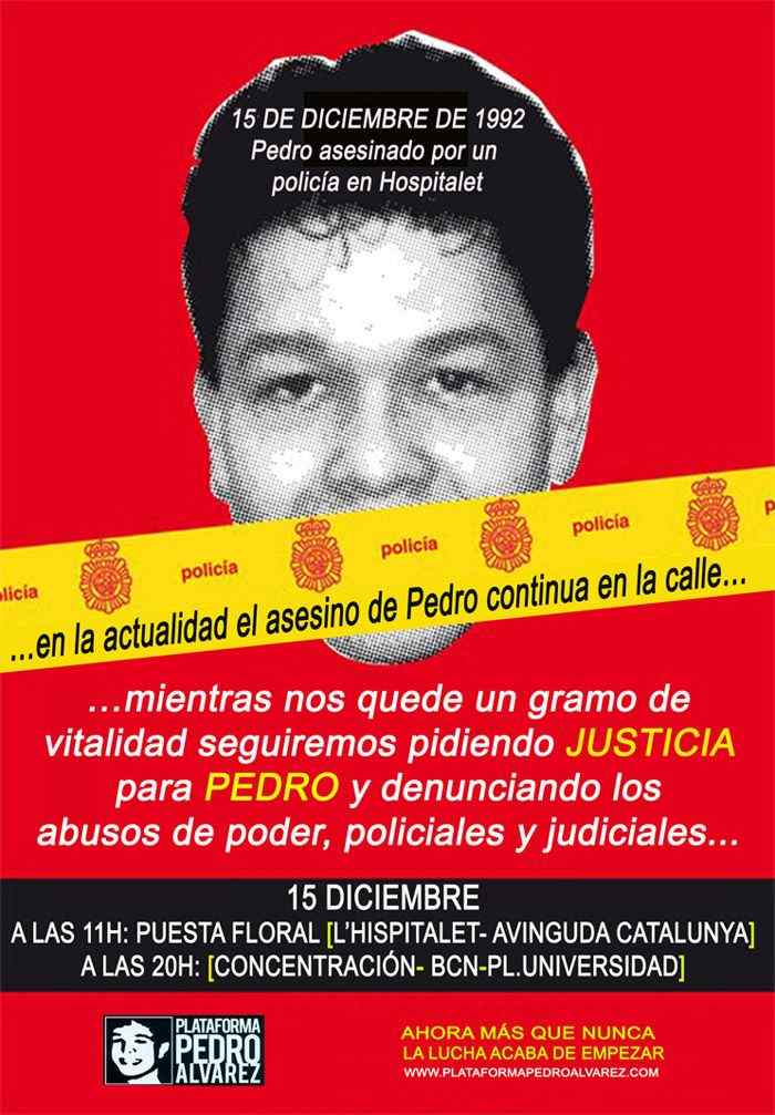 Cada 15 de diciembre aparece alguna pintada o algún elemento en las calles del Hospitalet del Llobregat que lo recuerda. "Pedro Álvarez, asesinado por un policía", se suele leer. 24 años después que fuera asesinado, y que el principal sospechoso de matarlo de tres tiros en la cabeza fuera un miembro de la policía nacional, el caso Pedro Álvarez sigue estando al orden del día. Todavía no se ha juzgado.