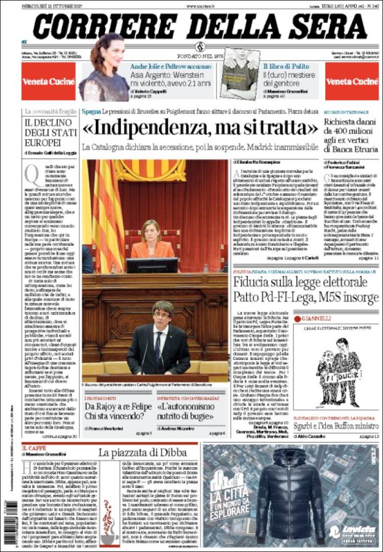 La noticia principal del Corriere della Sera tiene que ver con Catalunya, de la qual se dice que "declara la independencia, pero la suspende":