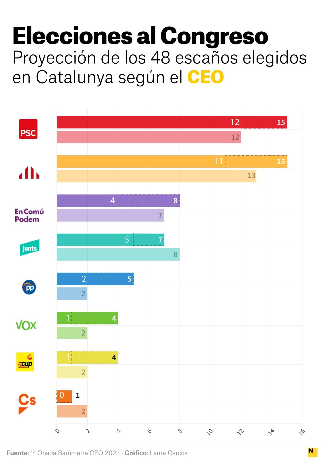 Con las elecciones generales previstas para antes que acabe este 2023, el Centre d'Estudis d'Opinió ha incluido los resultados del Congreso de los Diputados en su primer barómetro del año. Y ERC y el PSC se cambiarían los papeles con respecto a los últimos comicios del 2019: igual que en el Parlament los socialistas superarían a los republicanos en intención de voto, pero la encuesta les da una estimación de escaños muy similar a los dos partidos: entre 12 y 15 para el PSC, que actualmente tienen 12, y entre 11 y 15 por ERC, que ahora cuenta con 13 representantes. Concretamente, el CEO da una estimación de voto de entre el 23 y el 27% para los socialistas, superando el 20,6% que obtuvieron en las últimas elecciones; mientras ERC, que el 10-N consiguió una victoria histórica, se queda solo con entre un 19 y un 23% de los votos.