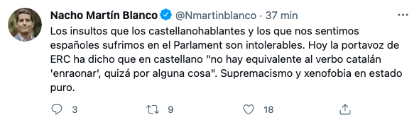 Minutos después, ha pronunciado un tuit desde el mismo hemiciclo volviendo a denunciar el discurso de Vilalta: "Los insultos que los castellanohablantes y los que nos sentimos españoles sufrimos en el Parlament son intolerables. Hoy la portavoz de ERC ha dicho que en castellano 'no hay equivalente al verbo catalán enraonar, quizás por alguna cosa'. Supremacismo y xenofobia en estado puro".
