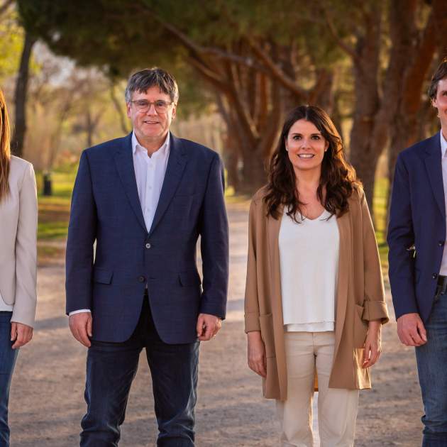 De izquierda a derecha, los cabezas de lista de Junts en las demarcaciones de Lleida, Jeannine Abella; Barcelona, Carles Puigdemont; Tarragona, Mònica Sales; y Girona, Salvador Vergés / Junts