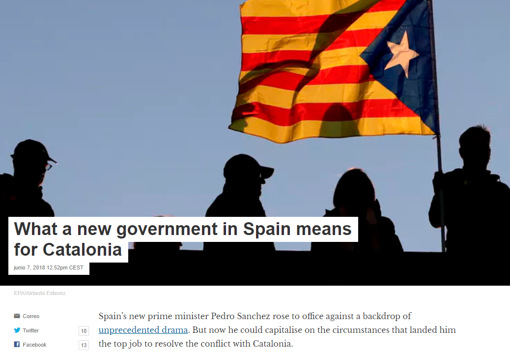 La revista política australiana The Conversation ha analizado qué puede representar el nuevo Gobierno de Pedro Sánchez para Catalunya, y apunta que toda negociación tendrá que comportar de entrada la supresión total de la intervención de la Generalitat y una solución para los presos políticos. A partir de aquí prevé que aparezcan diferencias, porque calcula que la reivindicación mínima de los catalanes será un referéndum pactado de autodeterminación, mientras que Sánchez, por la presión de PP y Cs y del mismo PSOE, tendrá que formular alguna otra propuesta.
