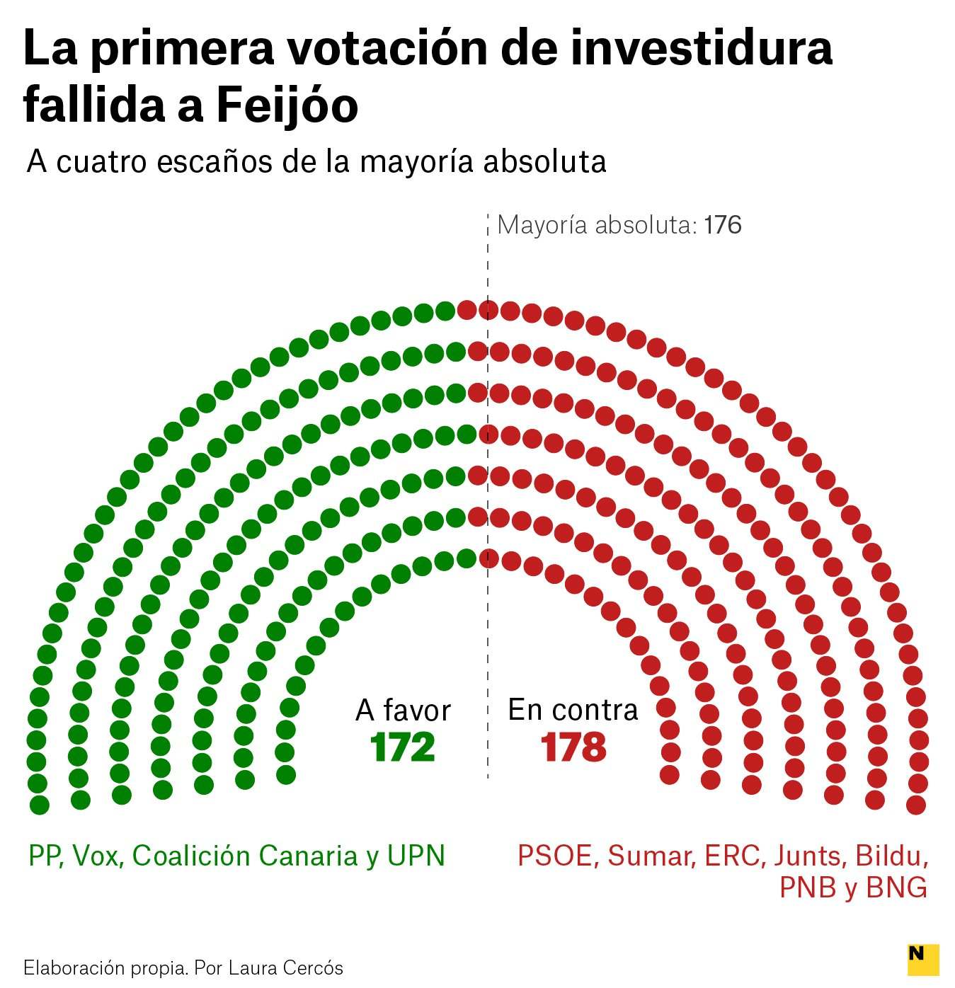 Alberto Núñez Feijóo ha dado este miércoles un paso más para coronarse como jefe de la oposición. El líder del PP ha perdido la primera oportunidad para reemplazar a Pedro Sánchez al frente de la Moncloa al salir derrotado por mayoría absoluta en la primera votación para la investidura como presidente del Gobierno. Los 178 votos negativos del PSOE, Sumar, Esquerra Republicana, Junts per Catalunya, Bildu, PNV y BNG han superado los 172 afirmativos del PP, Vox, Coalición Canaria y UPN. Ha sido, todo, un debate eclipsado por la amnistía y la figura de Carles Puigdemont. El president de la Generalitat en el exilio ha sido el artefacto de la derecha y la extrema derecha para desgastar a Pedro Sánchez, conocedores de que en los próximos días los focos estarán, más que nunca, centrados en la conexión telefónica Ferraz-Waterloo.