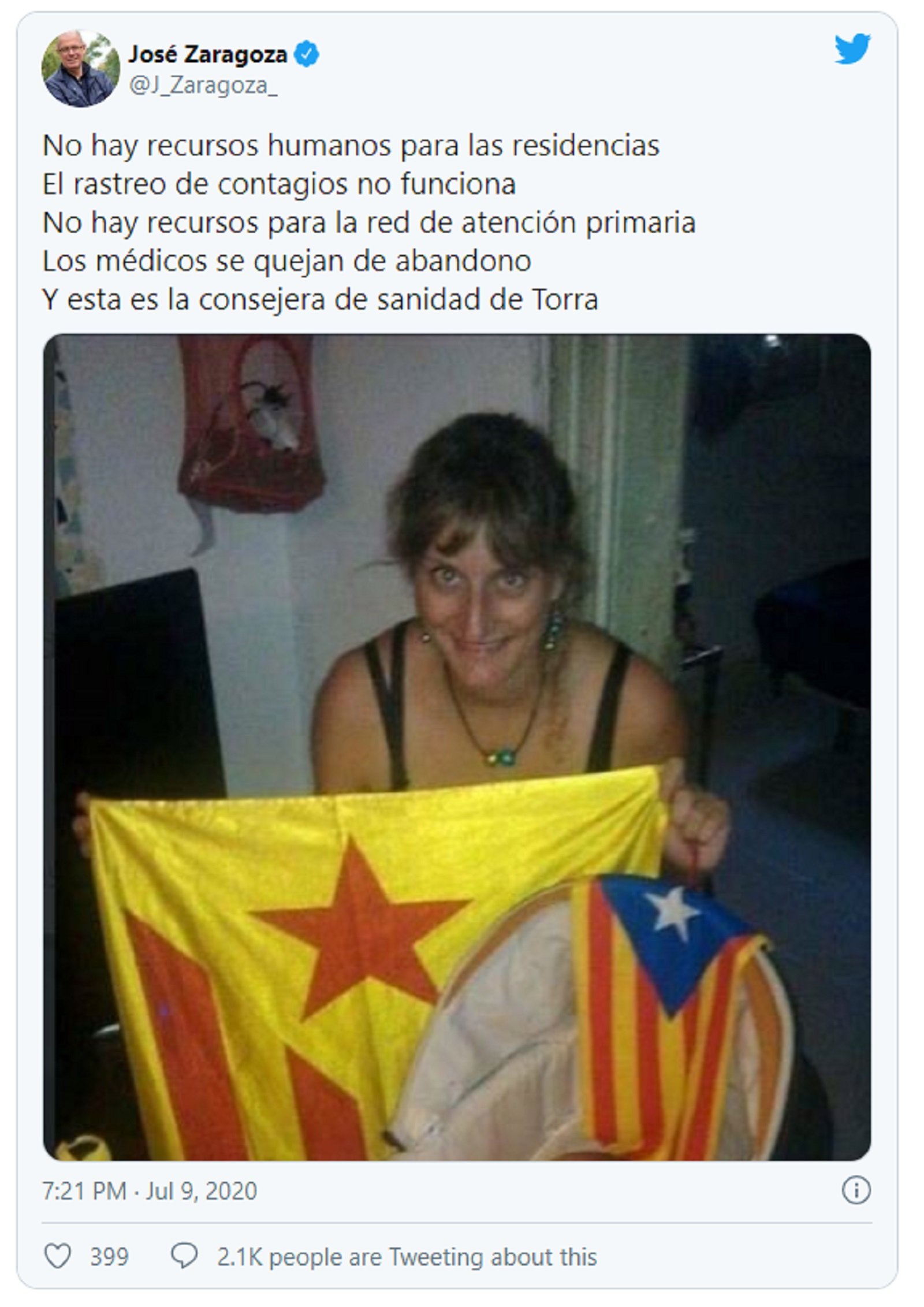 Ataque personal del diputado del PSOE José Zaragoza contra la consellera de Salut, Alba Vergés. En un mensaje público en su cuenta de Twitter, Zaragoza publicó el jueves por la tarde una fotografía de la responsable de Salut con un bebé. En el texto que la acompañaba, el socialista denunciaba la "mala gestión" del Govern de la pandemia de la Covid-19. Una acción que ha tenido una fuerte repercusión hasta que la misma consellera le ha respondido, contundente. "El descrédito de la política ha llegado a cuotas tan bajas por culpa de gente como tú", ha concluido Vergés.