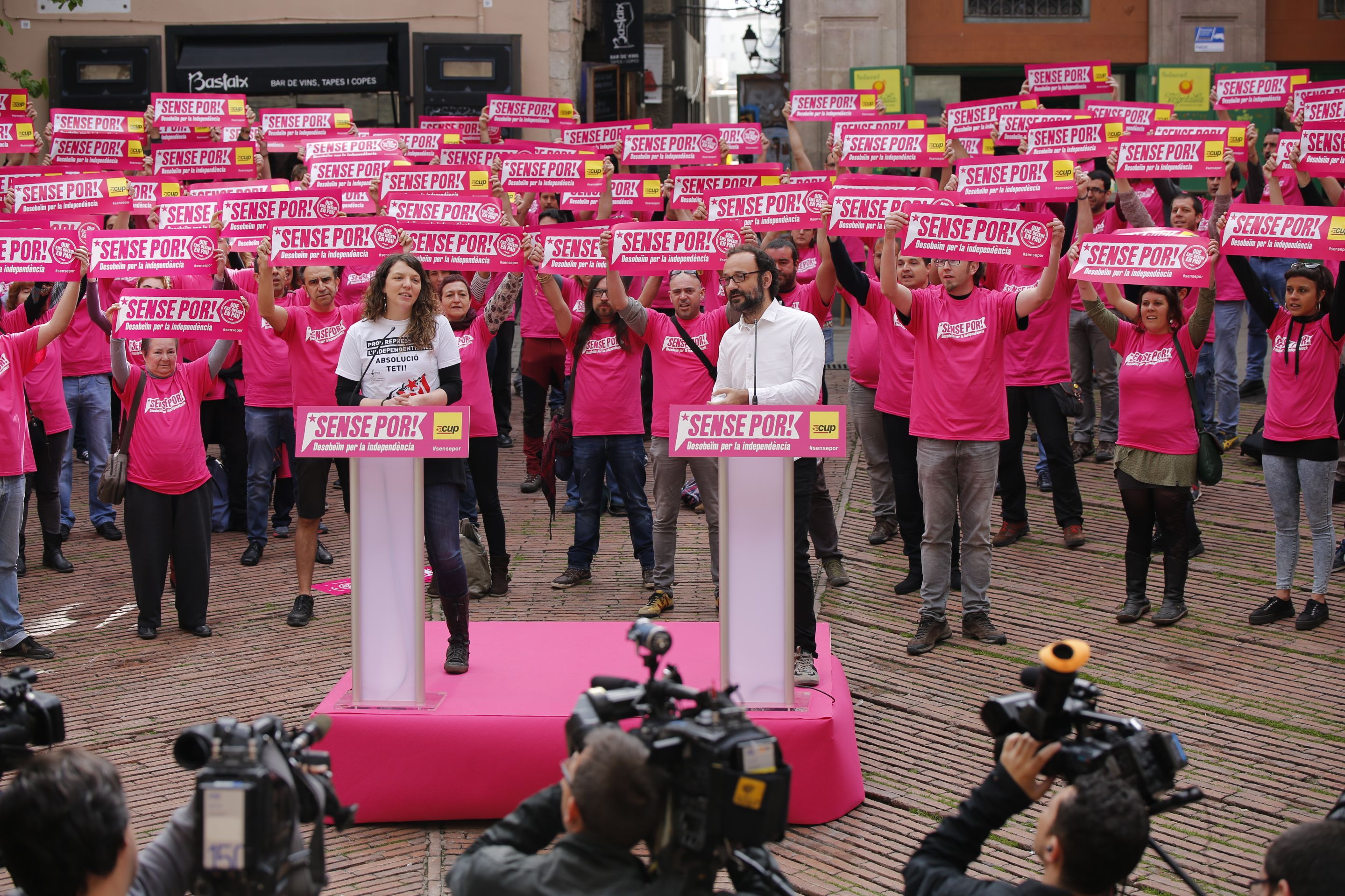 Precisamente en torno a estos ejes ha girado el acto organizado por los cupaires esta mañana bajo el lema Sense por, en el Fossar de les Moreres de Barcelona, en apoyo a los cargos electos que se ven requeridos por la Audiencia Nacional a raíz de la aprobación de mociones en apoyo a la declaración del 9-N.