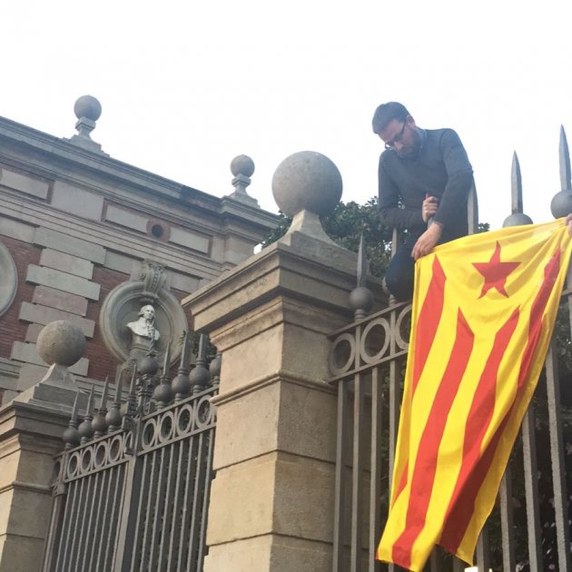 Después de salir del edificio y sumarse a la manifestación con motivo del pleno de investidura previsto, han vuelto a la Cámara y, desde dentro del recinto, han colgado la estelada en la reja.