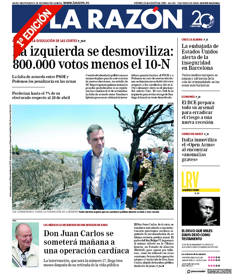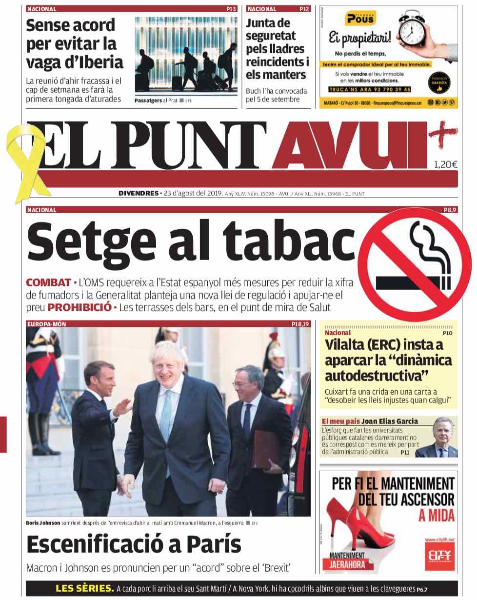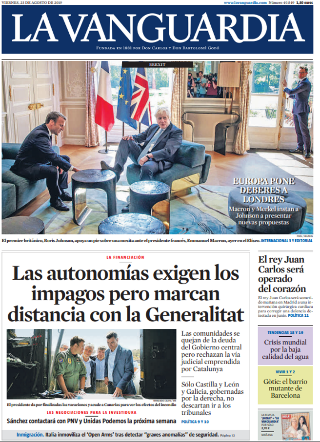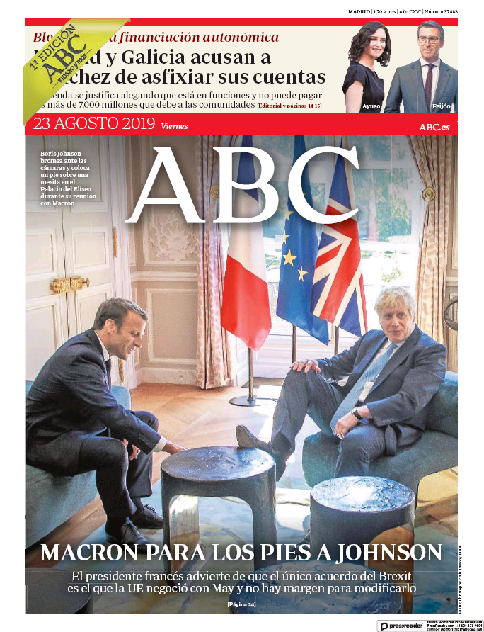 El enredo lo explica Tom Rayner, corresponsal político del canal británico de televisión Sky. Macron rompe el hielo diciendo a Johnson que la mesilla puede servirle de escabel si desea recostarse en el asiento, cosa que el primer ministro británico hace para seguirle el buen rollo al presidente francés. Ciertamente, es difícil resistirse a publicar una foto como esta, peeeeero... ningún diario británico lleva esa imagen en portada, ni siquiera los que le tienen ganas al premier. En cambio, un diario de Su Majestad hace un titular acertadísimo: "Johnson choca con la resistencia francesa". Muy fino.