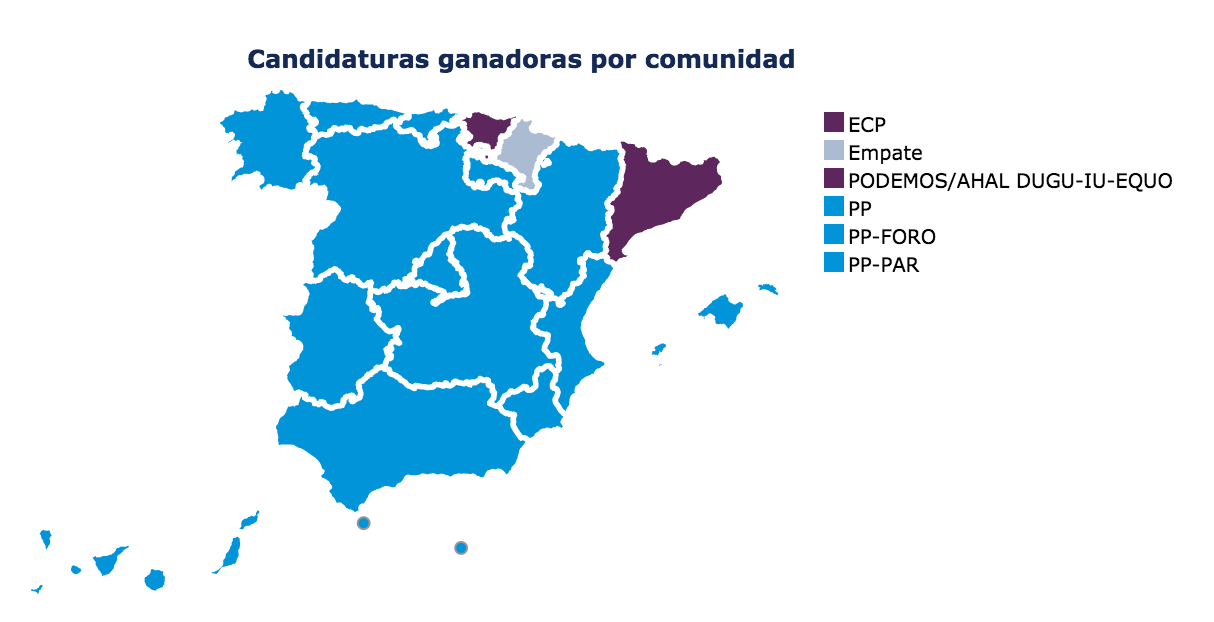 De punta a punta de la península, sumando los territorios insulares, el mapa electoral de España se ha vuelto de color azul, con sólo dos excepciones: Catalunya y el País Vasco. El Partido Popular (PP) ha conseguido imponerse en escaños en 15 de las 17 comunidades autónomas, a pesar del empate tècnico con la formación morada en la Comunidad Foral de Navarra. En territorio catalán ha ganado En Comú Podem, y en Euskadi, la coalición de Podemos. La sorpessa ha venido dada por Andalucía: el feudo histórico socialista de la presidenta Susana Díaz ha sido desbancado no por los podemitas, sino por el PP.