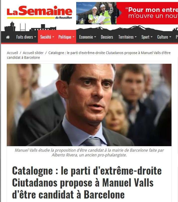 Le parti d'extrême-droite Ciutadanos propose à Manuel Valls d'être candidat à Barcelone https://t.co/5RirNpran2 via @lasemainedurous