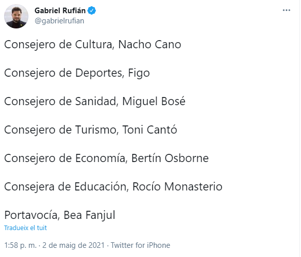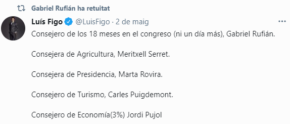 En cambio, quien tiene claras las cosas es el diputado de Esquerra Republicana en el Congreso de los Diputados, Gabriel Rufián. El republicano se ha imaginado cómo será el futuro gobierno de la Comunidad de Madrid si triunfa la Popular Ayuso. Una broma que le ha costado una disputa con el exfutbolista Luís Figo, a quien Rufián ha nombrado consejero de Deportes. El líder de ERC en Madrid se lo ha tomado con filosofía e incluso le ha hecho retuit.