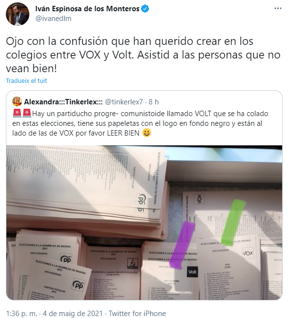 Grito de alerta de Iván Espinosa de los Monteros. El portavoz de Vox tiene miedo de que sus electores no sepan distinguir entre su partido y Volt, un partido paneuropeo que se fundó en el 2017. El marido de la candidata del partido de ultraderecha a la presidencia de la Asamblea, Rocío Monasterio, ha acusado a los colegios electorales de querer causar confusión.