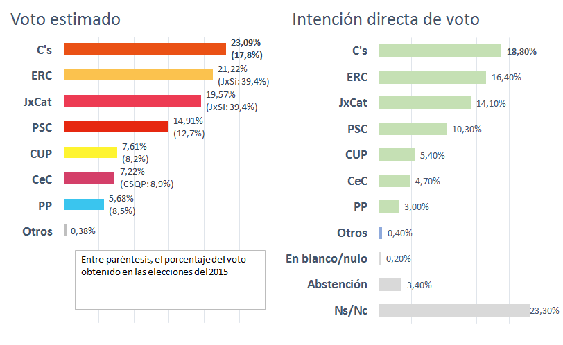 Cs sigue siendo la fuerza más votada, como ya sucedía en la cuarta encuesta, publicada hace 48 horas, pero pierde porcentaje en la proyección de voto estimado, de un 23,57% a un 23,09%, y diputados, de una horquilla de 32-33 a 31-32. Por el contrario, ERC, desplazada de la primera posición en la anterior entrega, mejora en porcentaje, de 20,89% a 21,22%, y escaños, de 30-31 a 30-32. JuntsXCat sube y alcanza su mejor marca de la serie, con un 19,57% y 28-30 diputados y, por primera vez, puede igualar a ERC en escaños.