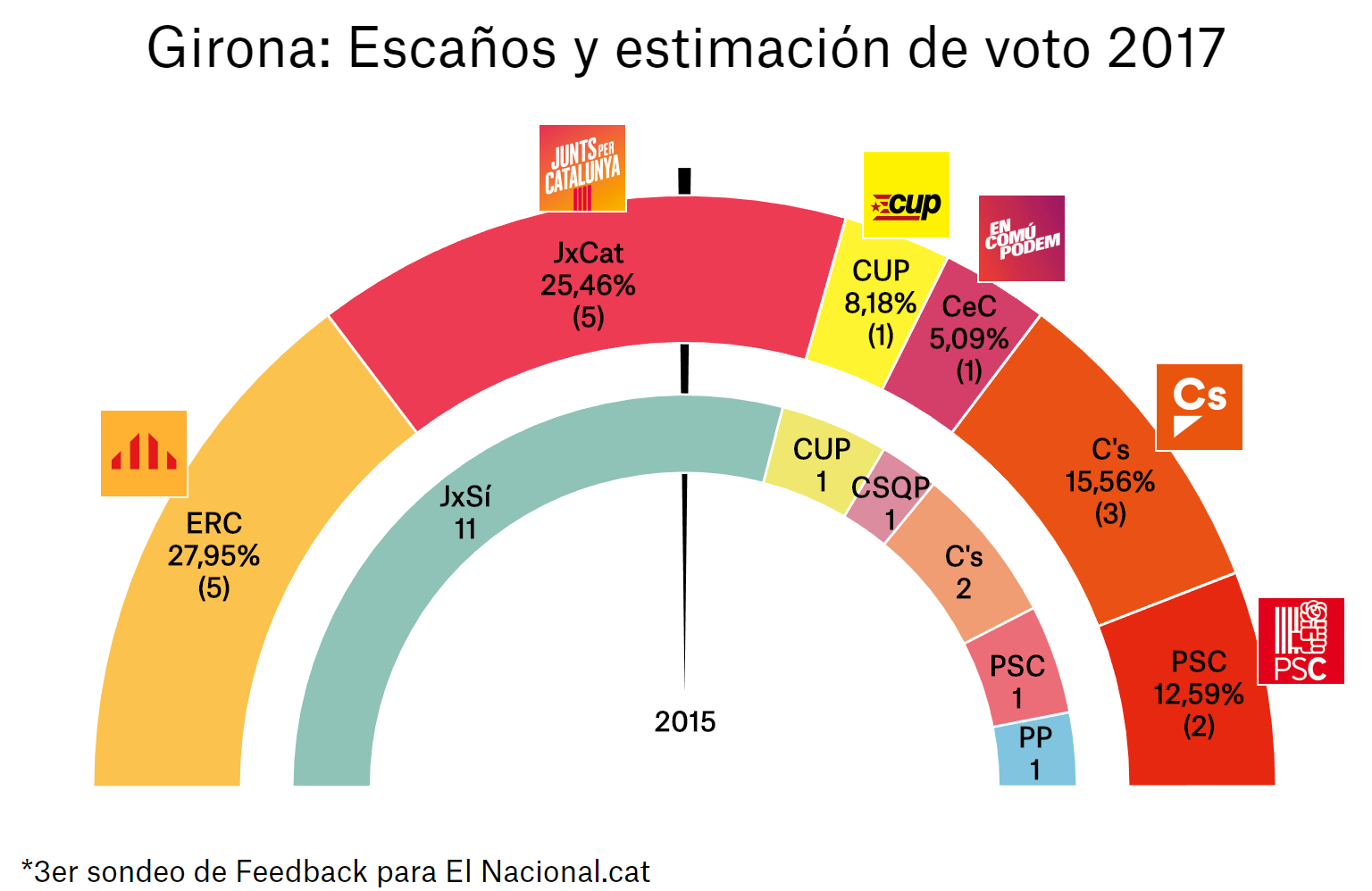 En Girona, que elige 17 diputados, ERC mantiene la primacía que ya le otorgaban el primer y el segundo sondeo pero cede el escaño que se disputaba con JuntsXCAT, por lo que las fuerzas quedan equilibradas con 5 actas para cada una de las dos formaciones independentistas. Cs mantiene 3 diputados -baja ligeramente en porcentaje de voto-; el PSC 2 -con un ligero incremento de voto-; la CUP 1 -mejora el porcentaje-; CeC-Podemos 1 -baja- ; y el PP continúa fuera del reparto a pesar de un ligero incremento en la proyección de voto estimado.