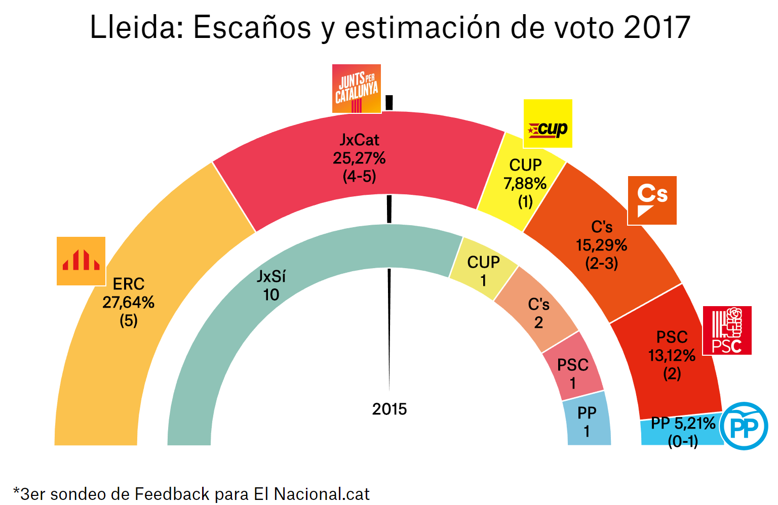En Lleida, ERC sigue en cabeza con 5 diputados, aunque desciende en porcentaje de voto. JuntsXCAT, por el contrario, sube, y puede aspirar a sumar 1 escaño más a los 4 de la muestra anterior. Cs (2-3) no acaba de conseguir el tercer escaño, que se disputa con el PP (0-1). El PSC mantiene 2, con una ligera tendencia a la baja y Cec-Podem, en cambio, baja y se queda sin escaño, si bien en el anterior sondeo tampoco lo tenía garantizado. La CUP, lo consolida. La circunscripción de Lleida aporta 15 diputados al Parlament.