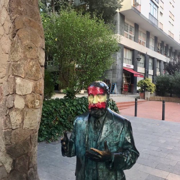 Por delante y por detrás. La estatua de Antoni Gaudí del barrio de Les Corts de Sarrià ha aparecido esta mañana pintada con banderas españolas: una en la cara y una en la espalda.