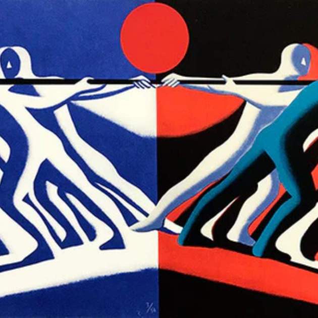 Imagen principal: Tug of War (juego de tirar de la cuerda, en inglés), de Mark Kostabi (1990) / Premier Pop Art