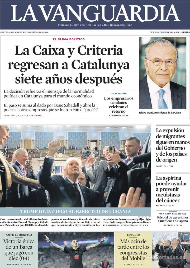 Por su parte, El Mundo intenta disimular la rabia que sintió este miércoles en saber que la Fundación la Caixa y CriteriaCaixa devuelven la sede social a Barcelona después de trasladarla a Palma en el 2017, a raíz del referéndum independentista del 1-O. La fundación bancaria presidida por Isidre Fainé y accionista único del brazo inversor argumentó en su momento que la decisión buscaba "mantener los intereses y la operativa normal de la entidad y mientras se mantenga la situación actual en Catalunya". En un comunicado, la fundación ha detallado que el retorno se ha aprobado por unanimidad y en sesión extraordinaria. El Gobierno atribuye la vuelta de La Caixa a "la normalización" de Catalunya y lo mismo asegura El Mundo en el titular principal de la jornada. En clave internacional, la portada también se refiere a la situación en Kyiv después de que "Trump debilite más a Ucrania al negarle la Inteligencia e Internet". Así lo confirmó este miércoles el director de la CIA, John Ratcliffe, en una entrevista con la cadena Fox News. Ratcliffe dijo que el intercambio de inteligencia podría reiniciarse después de la carta enviada el miércoles por Zelenski a Trump, en la cual el presidente ucraniano manifestaba su disposición a negociar la paz con Rusia, una cosa que podría significar abrir la puerta a la paz y la reconciliación.