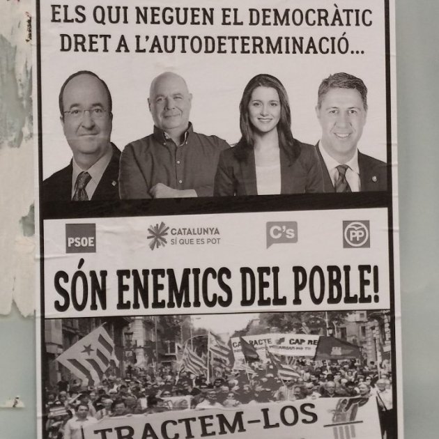 Acompañando las fotografías se puede leer 'Los que niegan el democrático derecho a la autodeterminación, ¡son enemigos del pueblo! Tratémosles como tales'. La fiscalía ha encargado a los Mossos D'Esquadra que investiguen los hechos.