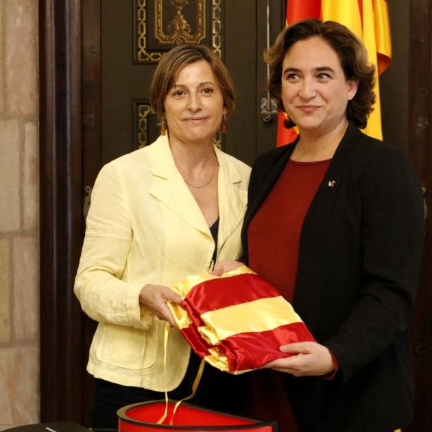 La presidenta de la cámara catalana, Carme Forcadell, ha regalado a Colau una bandera hecha a mano, edición limitada.
