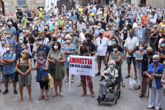 La plaza los ha recibido llena, aunque manteniendo las distancias, con esteladas clásicas y negras —las de la 'no rendición'—, una pancarta donde se podía leer "Bienvenidos, compatriotas, a la República Catalana", decenas de claveles que han repartido los organizadores y muchos abanicos para combatir el calor. A los ya ex-presos los han acompañado la presidenta del Parlament, Laura Borràs, los diputados de Junts Elsa Artadi y Francesc de Dalmases, y el exalcalde de Barcelona Xavier Trias.