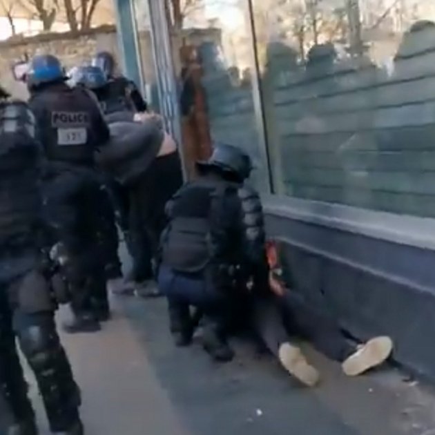Manifestant maîtrisé, au sol, puis frappé à terre.