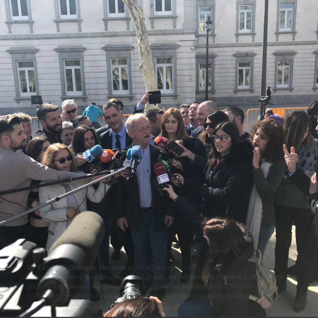El eurodiputado francés José Bové ha podido compartir con el conseller Raül Romeva una frase de Gandhi, coincidiendo con su presencia hoy en el juicio en el Tribunal Supremo. Bové, que conoce a Romeva desde que este era también eurodiputado, ha podido hablar brevemente con el conseller.