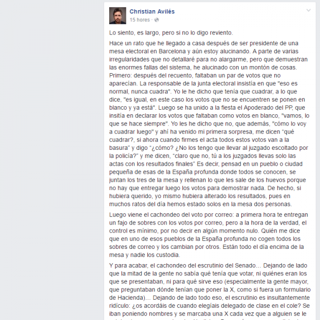 Efectivamente, después de ejercer de presidente en una mesa de Barcelona durante la jornada electoral, Avilés se decidió a contar su experiencia vía Facebook, relatando las muchas posibilidades de manipular el resultado final del voto.