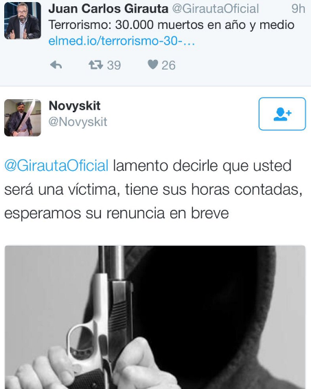 Girauta fue blanco ayer de dos tuits, acompañados de fotografías de pistolas, en respuesta a un mensaje suyo que enlazaba con un artículo titulado "Terrorismo: 30.000 muertos en año y medio".