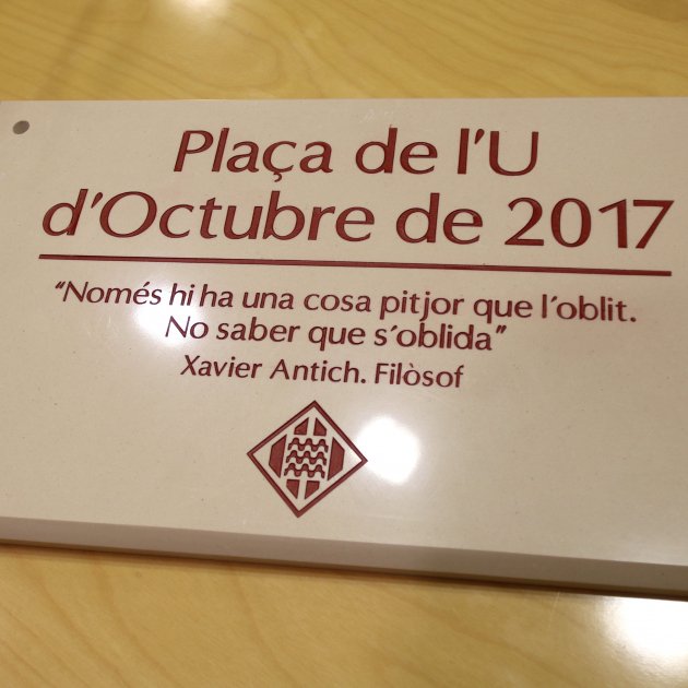 El cambio de nombre de la plaza de la Constitución de Girona que pasará a llamarse plaça de l'U d'Octubre se oficializará el sábado con una fiesta ciudadana. Esta mañana, el Ayuntamiento ha presentado las dos placas que se pondrán en los laterales de la plaza y que llevan inscrita la frase del filósofo Xavier Antich: "Sólo hay una cosa peor que el olvido. No saber que se olvida".