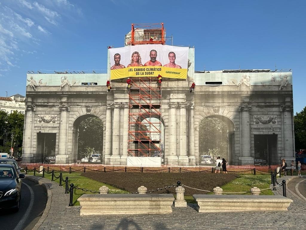 "En plena ola de calor y plena campaña electoral, colgamos una gran pancarta en la Puerta de Alcalá", ha afirmado Greenpeace en sus redes sociales, donde ha añadido: "El desafío mayor de nuestro tiempo exige vuestro máximo compromiso antes del 23J"