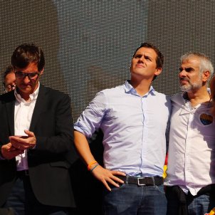 El PSC ha tenido escasa presencia oficial en la manifestación de Societat Civil Catalana este domingo en Barcelona. El máximo dirigente en la marcha era Salvador Illa, secretario de organización del PSC. Illa aparece a la izquierda de la foto, junto a diversos dirigentes de Ciutadans.